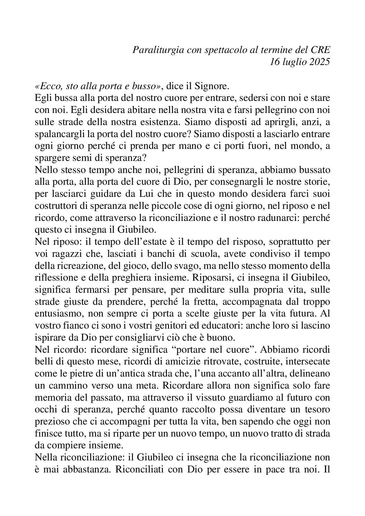 Omelia Paraliturgia con spettacolo al termine del CRE - 16 luglio 2025