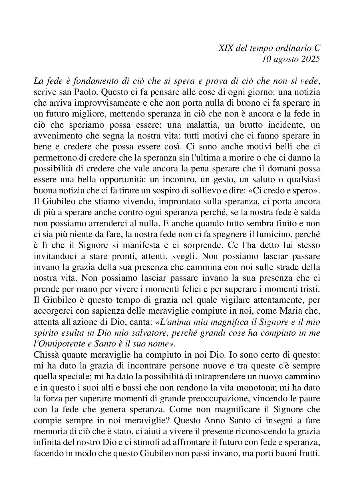 Omelia XIX del tempo ordinario C - 10 agosto 2025