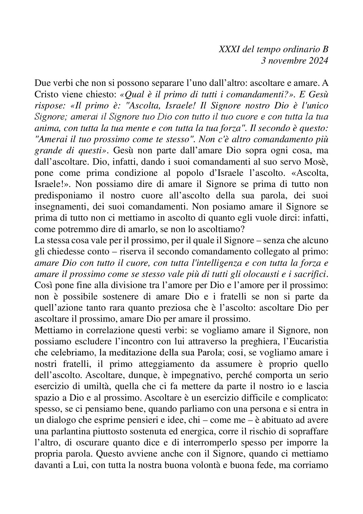 Omelia XXXI del tempo ordinario B 3 novembre 2024