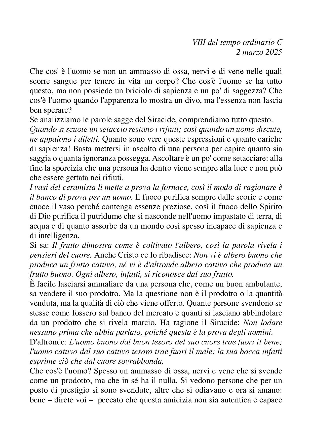 Omelia VIII del tempo ordinario C - 02 marzo 2025