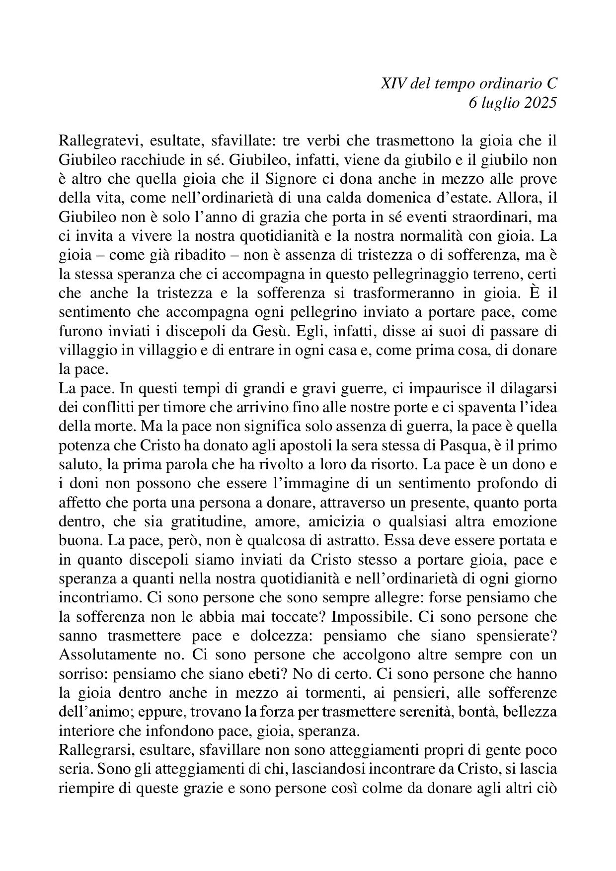 Omelia XIV del tempo ordinario C - 06 luglio 2025