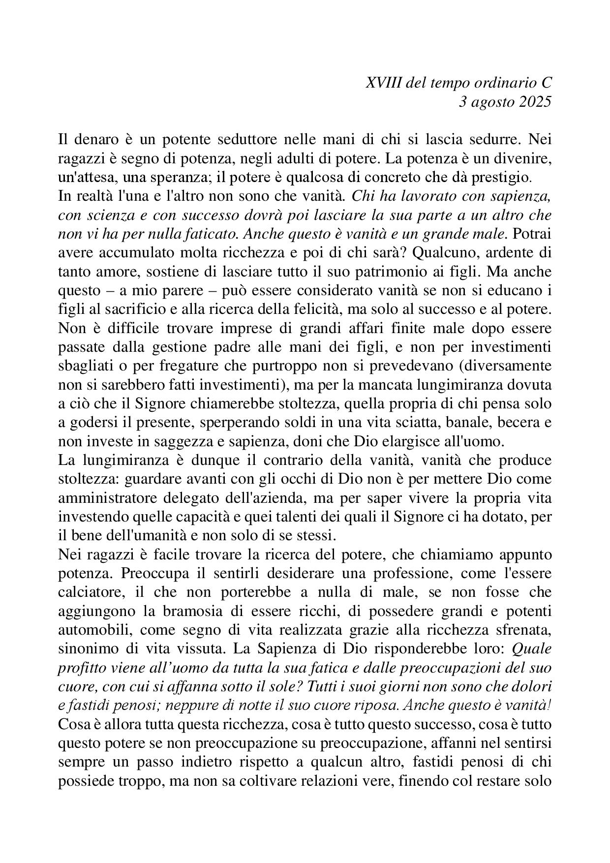 Omelia XVIII del tempo ordinario C - 03 agosto 2025